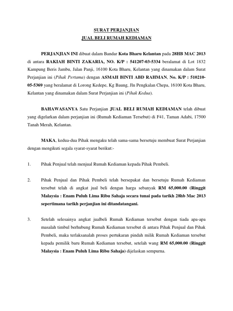 Anda perlu membuat surat perjanjian jual beli tanah. Dasar perumahan negeri selangor yang utama adalah untuk merealisasikan matlamat satu keluarga satu. Perkara 1 HARGA Jual beli rumah tersebut dilakukan dan dipersetujui oleh kedua belah pihak dengan ketentuan harga sebanyak berikut- RM2500000 dalam perkataan - Ringgit Malaysia Dua puluh lima ribu ringgit sahaja.
