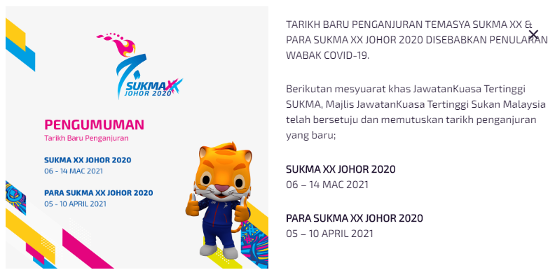 Dan kalendar beberapa temasya sukan tempatan dan antarabangsa pada 2021 juga terlalu rapat dengan beberapa tarikh penting seperti Ramadhan 13 April-12 Mei 2021 Euro 2020 yang ditangguhkan 11 Jun-11 Julai 2021 Sukan Olimpik 2021 Tokyo 23 Julai-8 Ogos 2021 dan Sukan Paralimpik 24 Ogos-5 September 2021 katanya dalam sidang akhbar di Menara KBS di Putrajaya. 08 - 13 mac 2021. Tarikh baru bagi SUKMA Johor 2020 akan diumumkan secepat mungkin malah Johor sebagai tuan rumah akan senantiasa bersedia dalam memastikan penganjuran SUKMA Johor 2020 mencapai piawaian penganjurannya katanya dalam kenyataan di sini hari ini.
